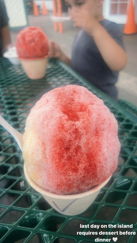 for our final night on the island, we had dessert before dinner at jojo’s shaved ice (because wishing well was closed) before heading to the terrace restaurant and bar for dinner. enzo got to try shaved ice for the first time and i thoroughly enjoyed my calamari and poke nachos from the terrace.