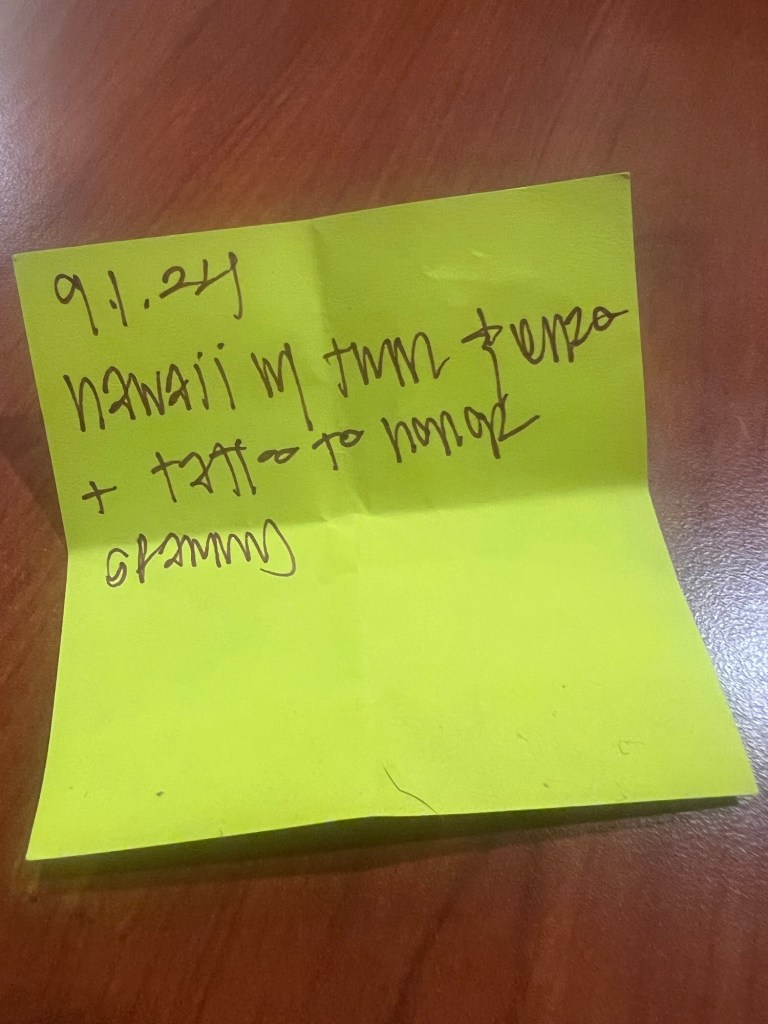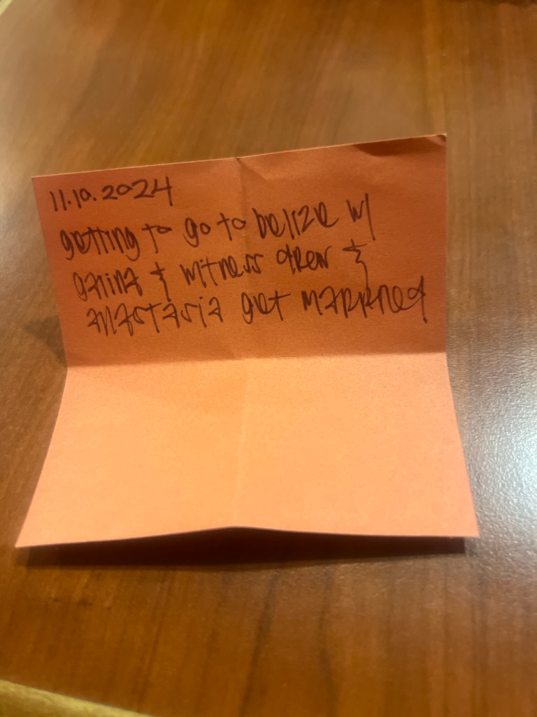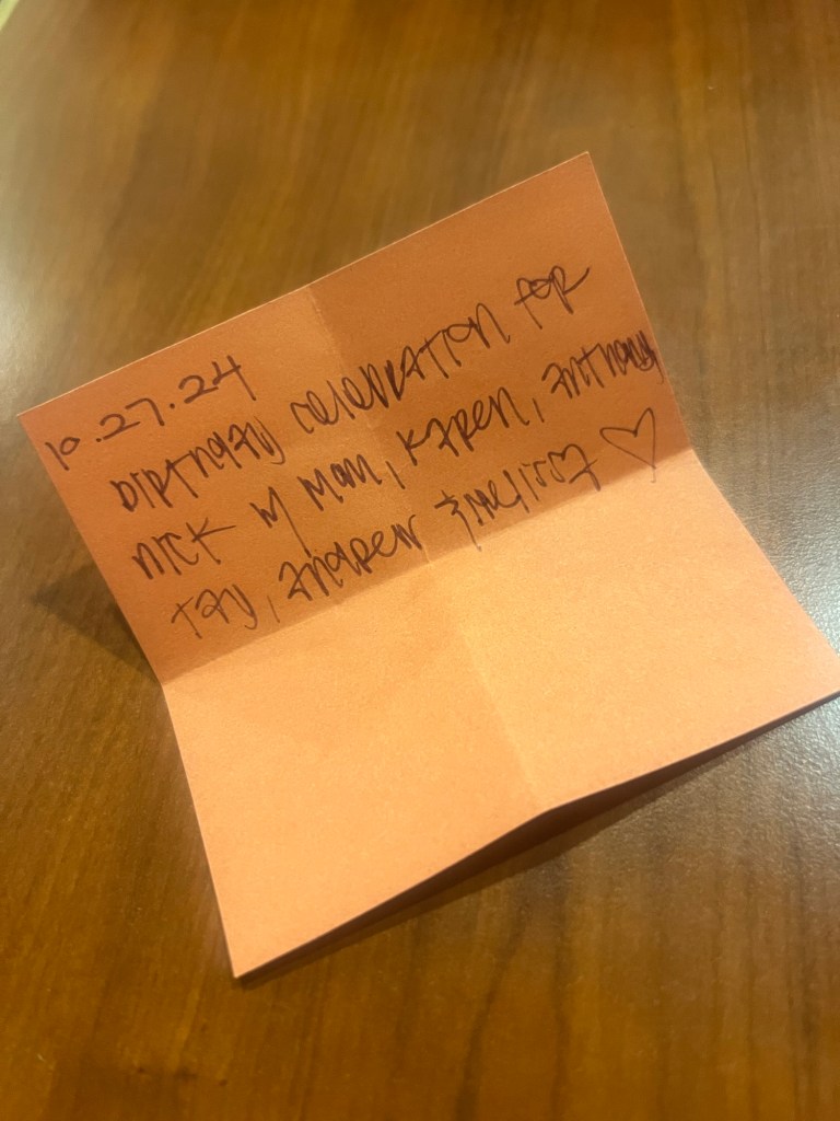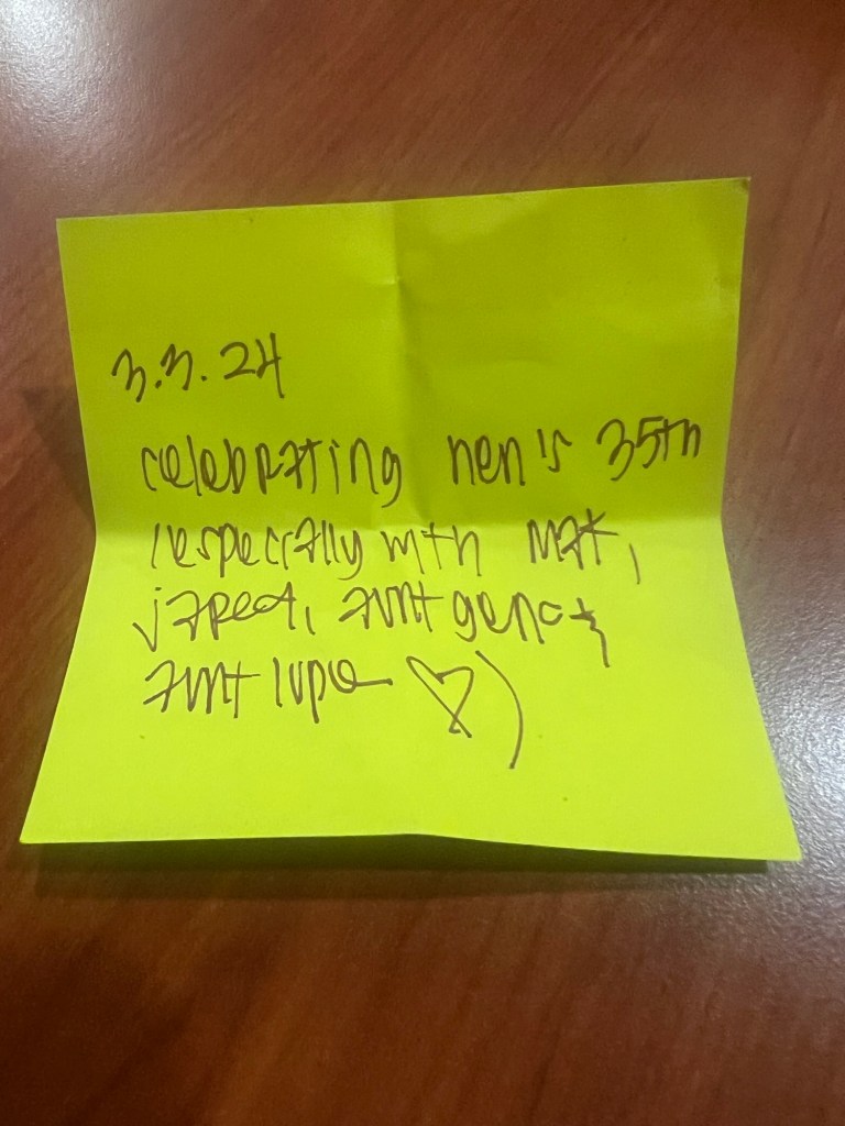 justin’s first week with the tir (therapist in residence program)heartfelt birthday brunch with theo, nen, tay, brianna, maria, jess, ale and reens with their favorite thing about me (leaning in to love)celebrating nen’s 35th (especially with mak, jared, aunt geno and aunt lupe 🤍) seeing no doubt in vip at coachella ❤️dad’s text about being in remission (almost one year to the day of me finding out about his cancer diagnosis)joe’s surprise 60th birthday hawaii with twin and enzo + tattoo to honor grammy birthday celebration for nick with mom, karen, anthony, tay, andrew and melissa 🤎getting to go to belize with galina and witness drew & anastasia get married friendsgiving potluck (hosted by me)first weekend in la – breakfast with tracy, cocktails with leighia, dinner with sonny, coffee with drew and stassi, boozy brunch with ram ram and dinner with mishi nye with frank and misu