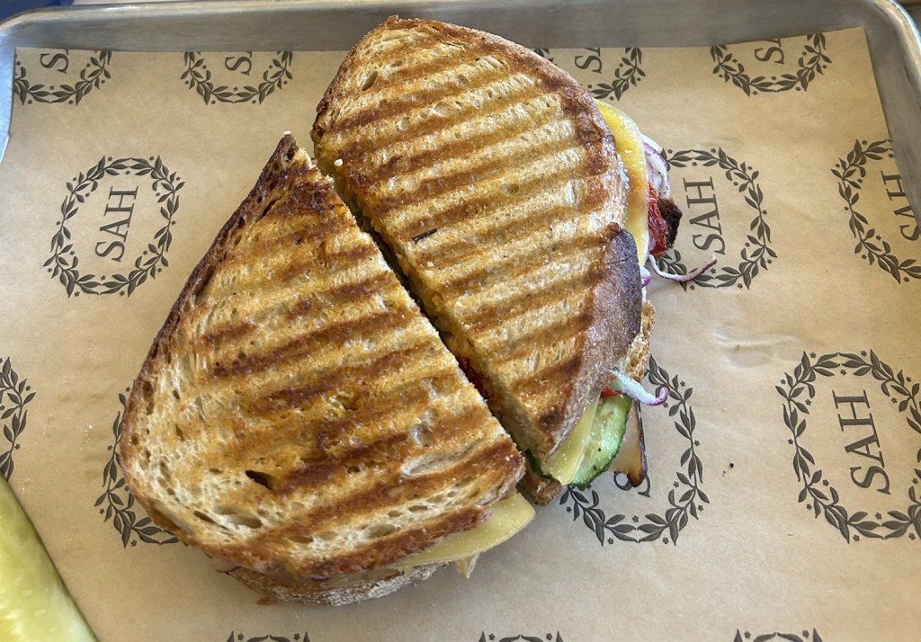 the voila comes with oven roasted turkey, smoked gouda, sun dried tomatoes, shaved cucumbers, red onion, sriracha aioli and salt & pepper grilled on their signature sourdough. 10/10 would recommend!