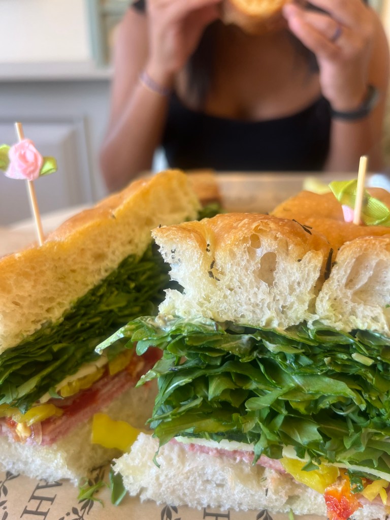 the cameron comes with salami, capicollo, mortadella, smoked provolone, sun dried tomatoes, banana peppers, red onion, fresh basil, italian spices, pesto aioli and salt & pepper served on focaccia. if i were describing sandwich in a few words, i would say: decadent, fresh and flavor-packed!