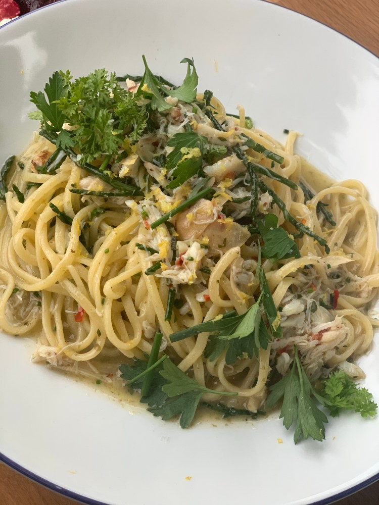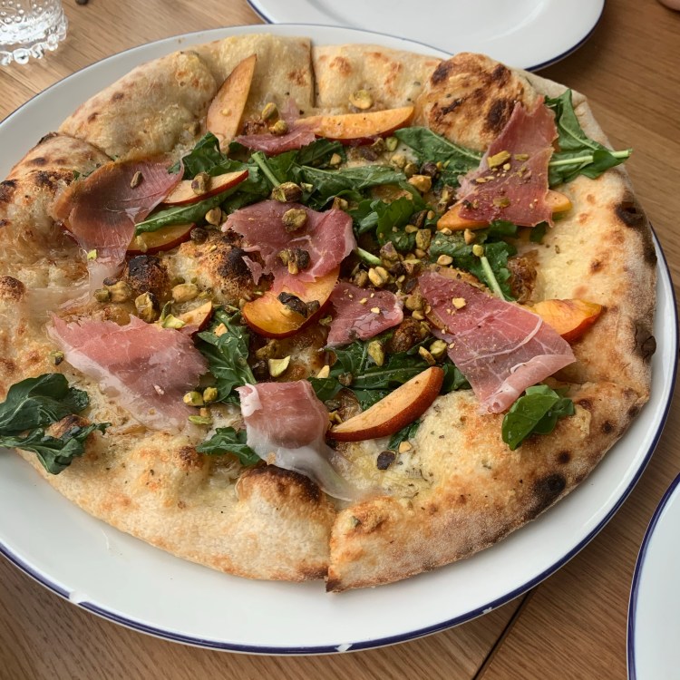 for our main courses, we went with the local field greens, linguini and crab, peaches and prosciutto pizza and the crispy boardwalk potatoes (which aren’t pictured due to us being in a trance from all of the goodness on our table).
