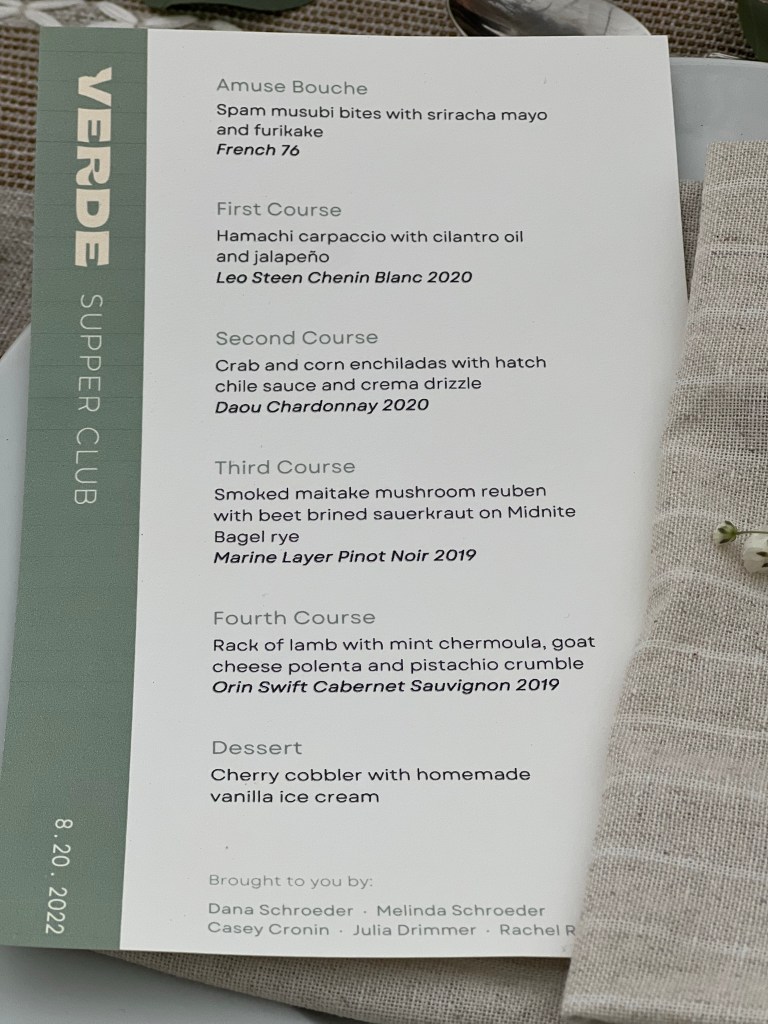 there is something so beautiful about seeing someone you love pursue something that sets their soul on fire. that is precisely how i felt when dana told me she was going to start a supper club. that is how verde supper club came to be.