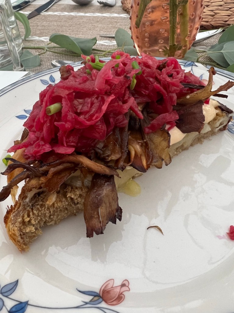 what i loved most about our third course is that it is not an item i would have ordered if i read it on a menu at a restaurant. after the very first bite, i knew i would have been gravely mistaken. the smoked maitake mushroom reuben with beet brined sauerkraut was NEXT LEVEL. the stunning presentation and the variety of textures alone were enough for me to want to have this for lunch daily. i certainly will be asking dana how she prepared this. with the heatwave we’ve been having, this would be the perfect meal on a hot day. and the marine layer pinot noir it was served with? *chef’s kiss*