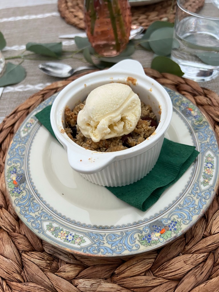 i thought i might not have room for dessert but once i realized it was a cherry cobbler with homemade vanilla ice cream, i quickly changed my tune. cherries don’t tend to be a fruit i seek out in desserts – i favor berries, lemons and peaches. after this dinner, my mind has been changed.