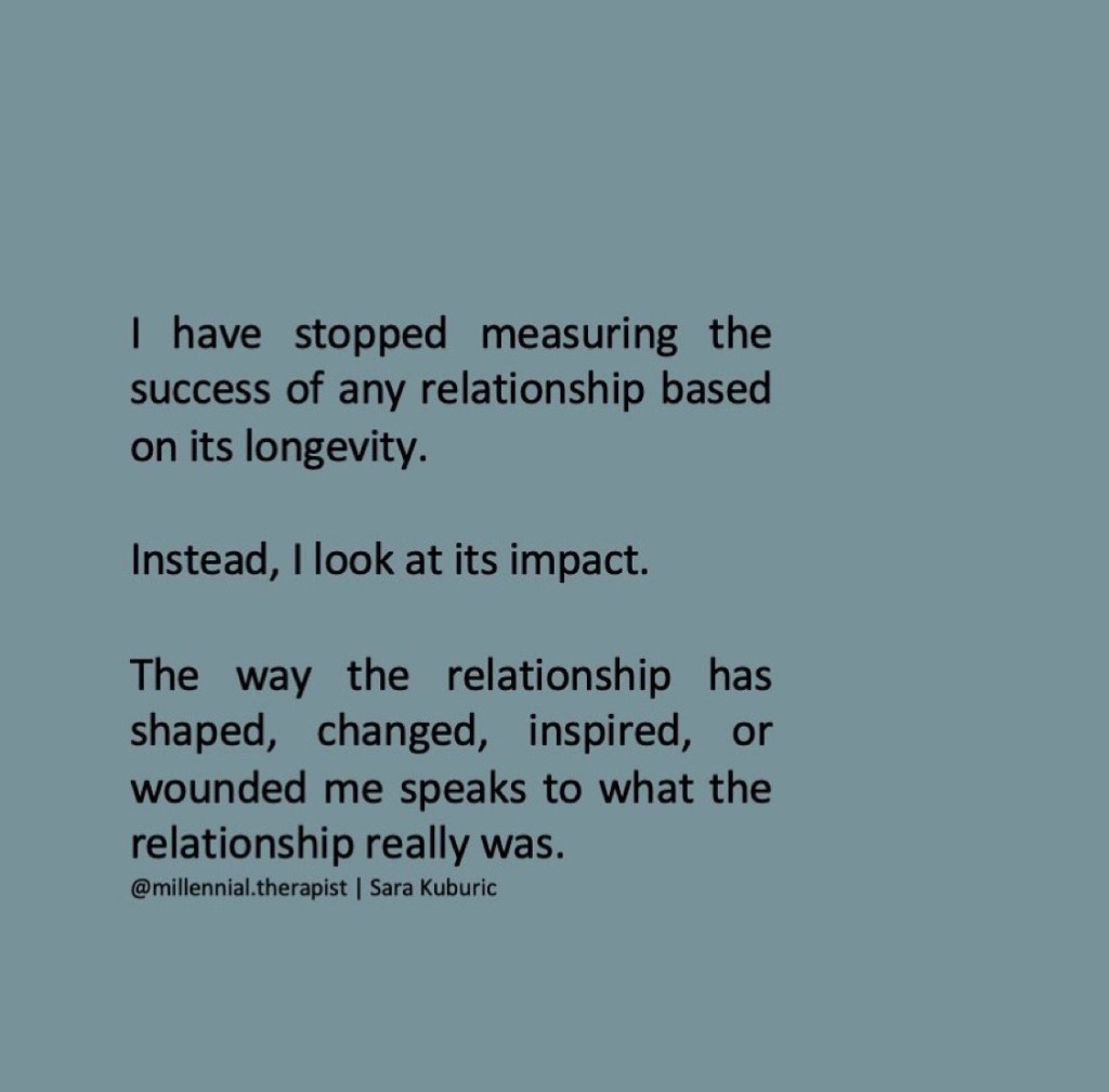 “i have stopped measuring the success of any relationship based on its longevity. instead, i look at its impact. the way the relationship has shaped, changed, inspired, or wounded me speaks to what the relationship really was.” -sara kuburic