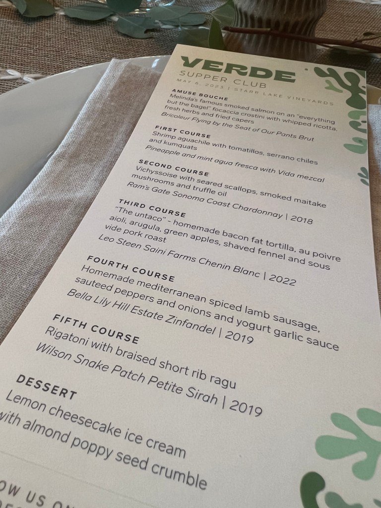 verde supper club menu – as soon as we saw it, we knew we were in for a treat!amuse bouche – melinda’s famous smoked salmon on an “everything but the bagel” focaccia crostini with whipped ricotta, fresh herbs and fried capers – served with bricoleur flying by the seat of our pants brut