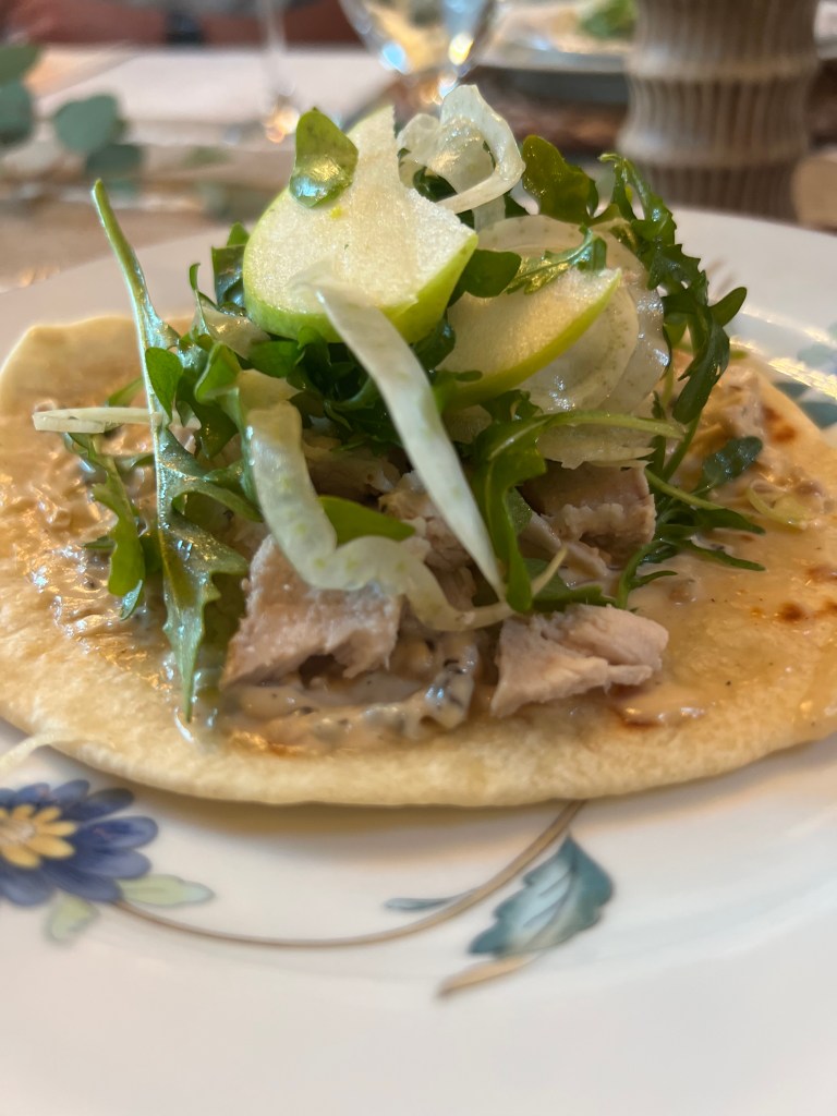 third course – “the untaco” homemade bacon fat tortilla, au poivre aioli, arugula, green apples, shaved fennel and sous vide pork roast – served with leo steen saini farms chenin blanc 2022