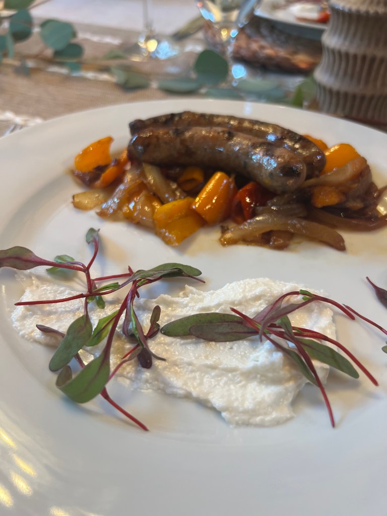 fourth course – homemade mediterranean spiced lamb sausage, sautéed peppers and onions and yogurt garlic sauce – served with bella lily hill estate zinfandel 2019