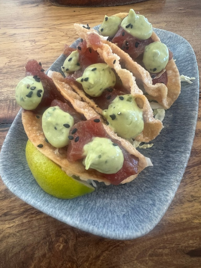the no ka oi was light and subtly sweet with a little punch at the end. i am going to try my hand at recreating it at home. while anj is gluten free, enzo and i aren’t so we enjoyed the focaccia without her. there was no way i was going to be in hawaii and not have fresh fish everywhere we went – the poke tacos were to die for. the wonton shells were light and flaky and the ahi melted like butter.