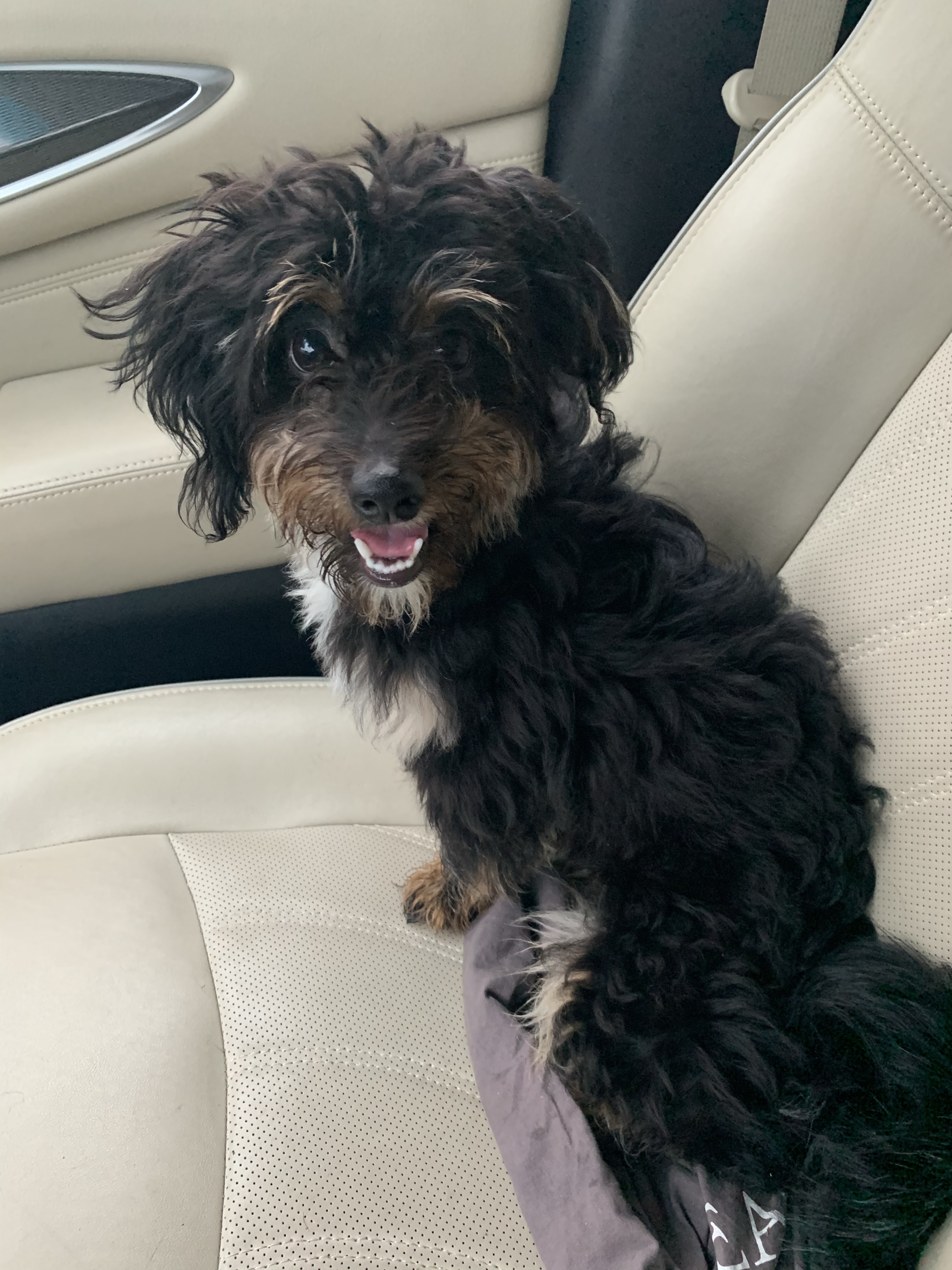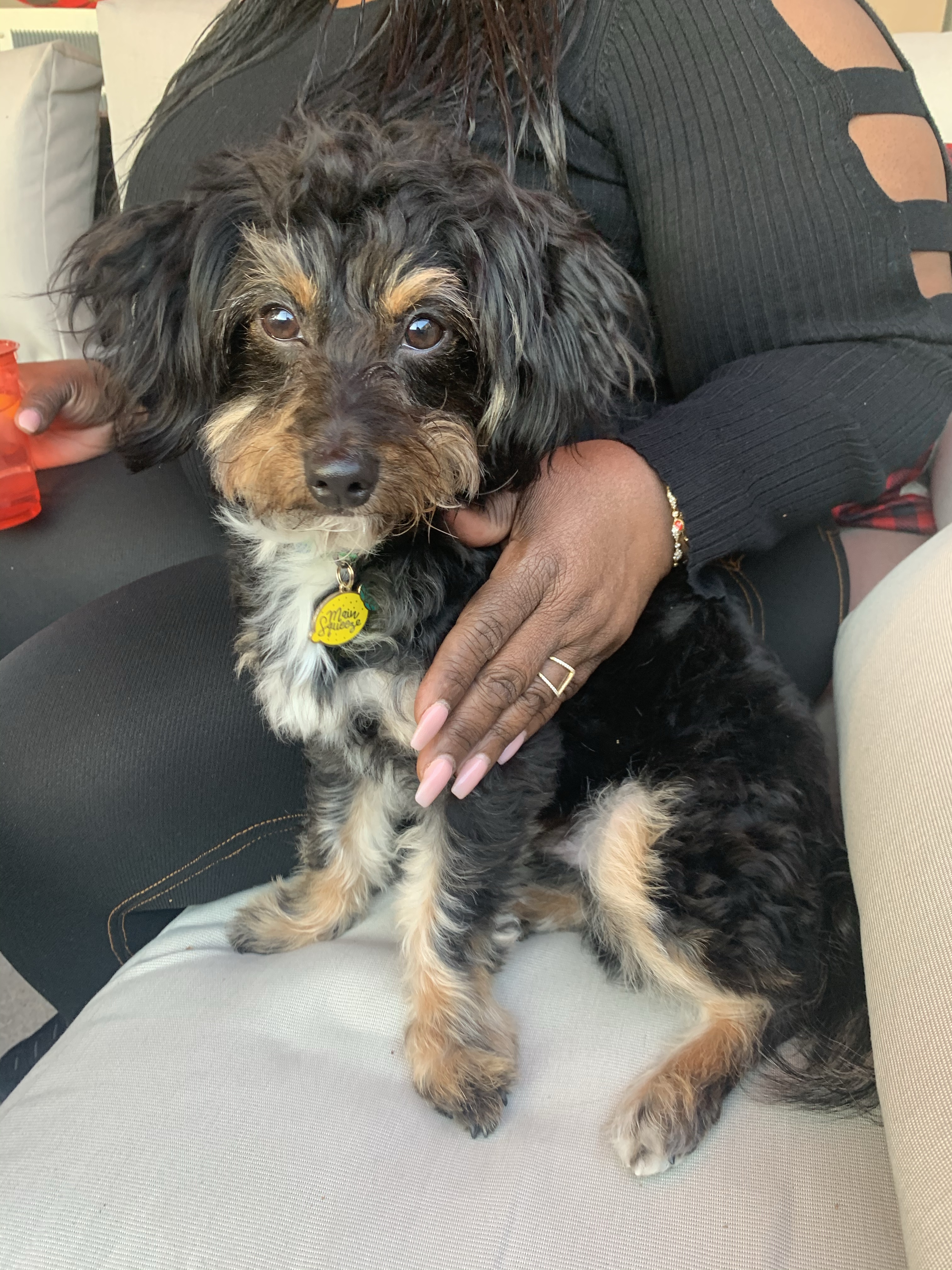 my cousin (courtney) posted about her pastor looking to get rid of their dog. when i asked about the breed and age, she said under a year and a maltipoo. i was floored. this already checked off two of my boxes. i figured there had to be a catch. so i reached out to the pastor and within 24 hours, we had arranged for me to pick up my pup on the following tuesday. here is a shot from our first moments together after he officially became mine.